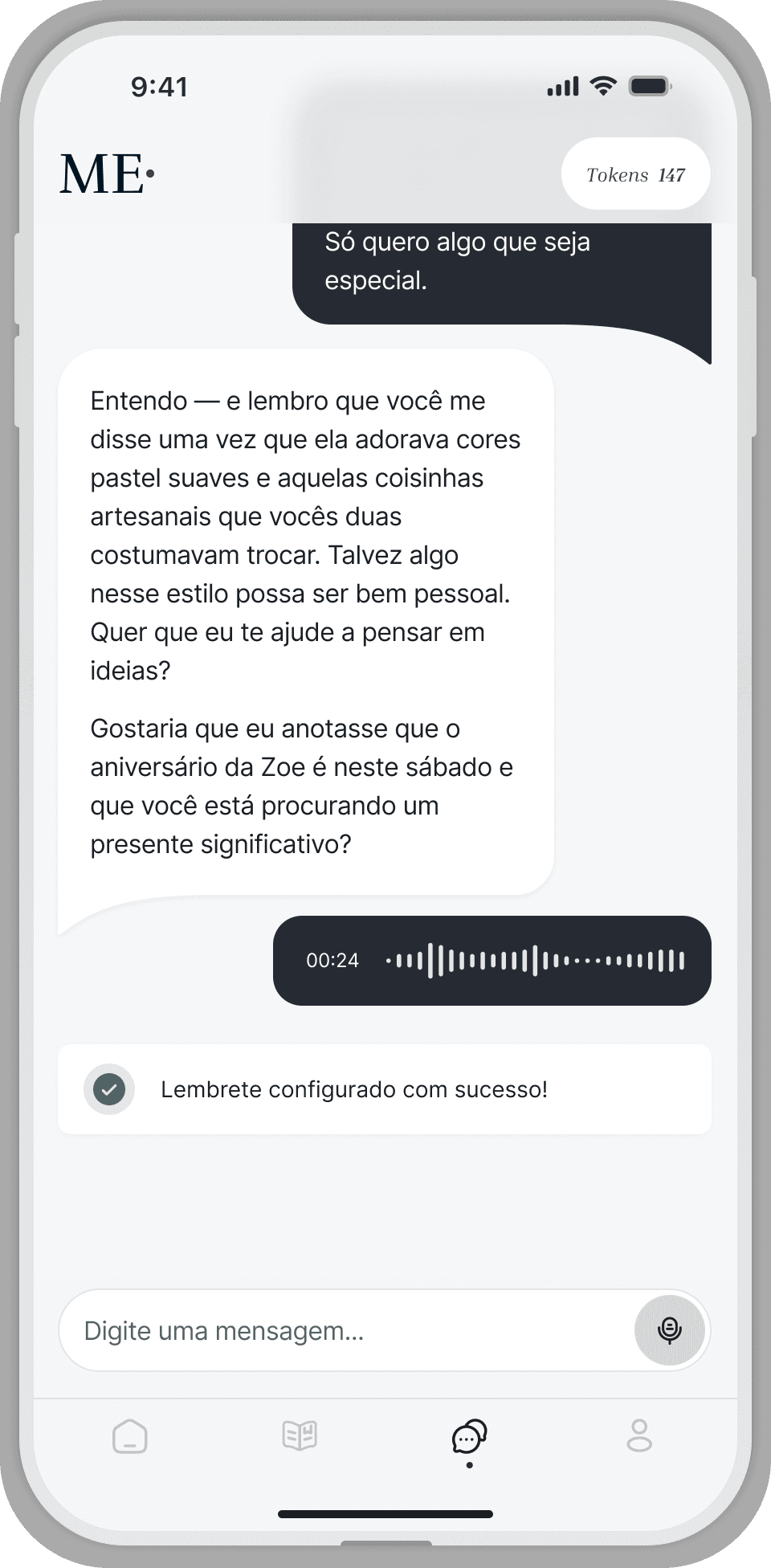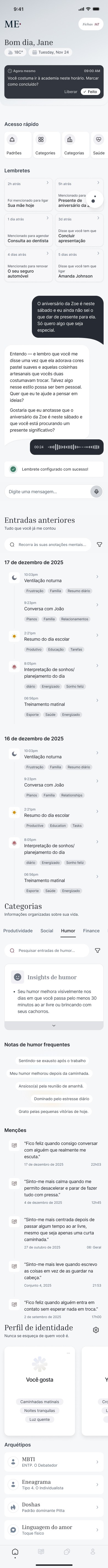 Capture ideias, organize seus pensamentos e recupere o que importa em segundos. O ME. transforma suas experiências em um sistema inteligente, conectado e pesquisável, para que nada importante se perca novamente.